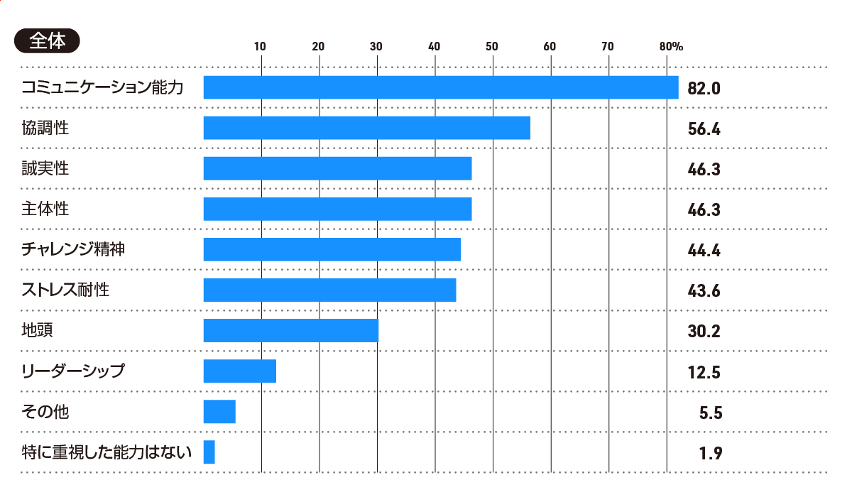 企業側が学生に求める能力は多種多様ですが、ここに大変興味深いデータがあります。新卒採用で特に重視した能力を調査した結果です。